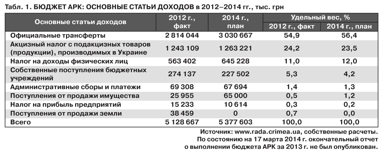 Понад 4 млрд грн з 5,4 млрд бюджету Криму-2014 становлять надходження з державного бюджету України. Кримський бюджет є хронічно дотаційним, незважаючи на те, що АРК є єдиним регіоном України, до бюджету якого зараховується акцизний податок на товари, вироблені в Україні (табл. 1).