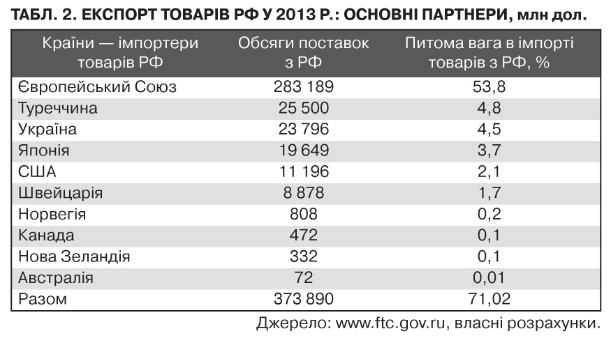 На Україну та країни демократичної коаліції, які засудили агресію РФ, припадає понад 71% російського товарного експорту 2013 р. (табл. 2).