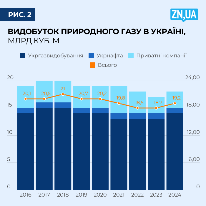 Однак значних коливань попиту та пропозиції щодо газу не було. Згідно з офіційною інформацією, 2024 року видобуток газу зріс на 2,2% і досягнув 19,1 млрд кубометрів (див. рис. 2). Значного збільшення споживання газу 2024 року не зафіксовано (приблизно 1,8%), а з початку війни його промислове споживання суттєво впало. Тобто на нерегульованому ринку існує профіцит газу, який мав би привести до зниження цін для промисловості, але вони підвищуються.