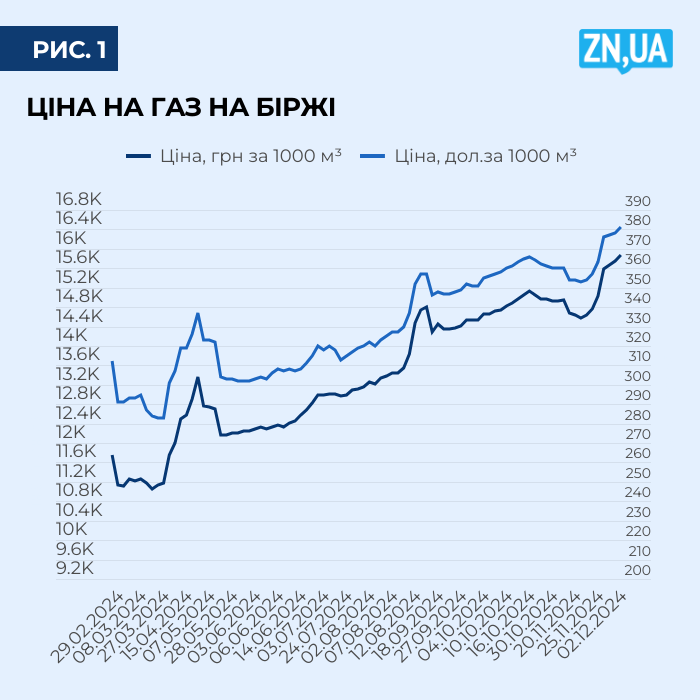 Зараз ціна на нерегульованому сегменті ринку визначається в основному за результатами торгів газом на біржі. На рис. 1 відображено динаміку ціни на газ на біржі: спостерігається стабільне зростання ціни протягом усього року. Навіть у доларовому еквіваленті ціна підвищилася з 283 дол. за тисячу кубометрів у березні 2024 року до близько 385 дол. у грудні. Це майже 35% зростання у доларовому еквіваленті з урахуванням девальвації гривні з 38 до 42 грн за долар США.