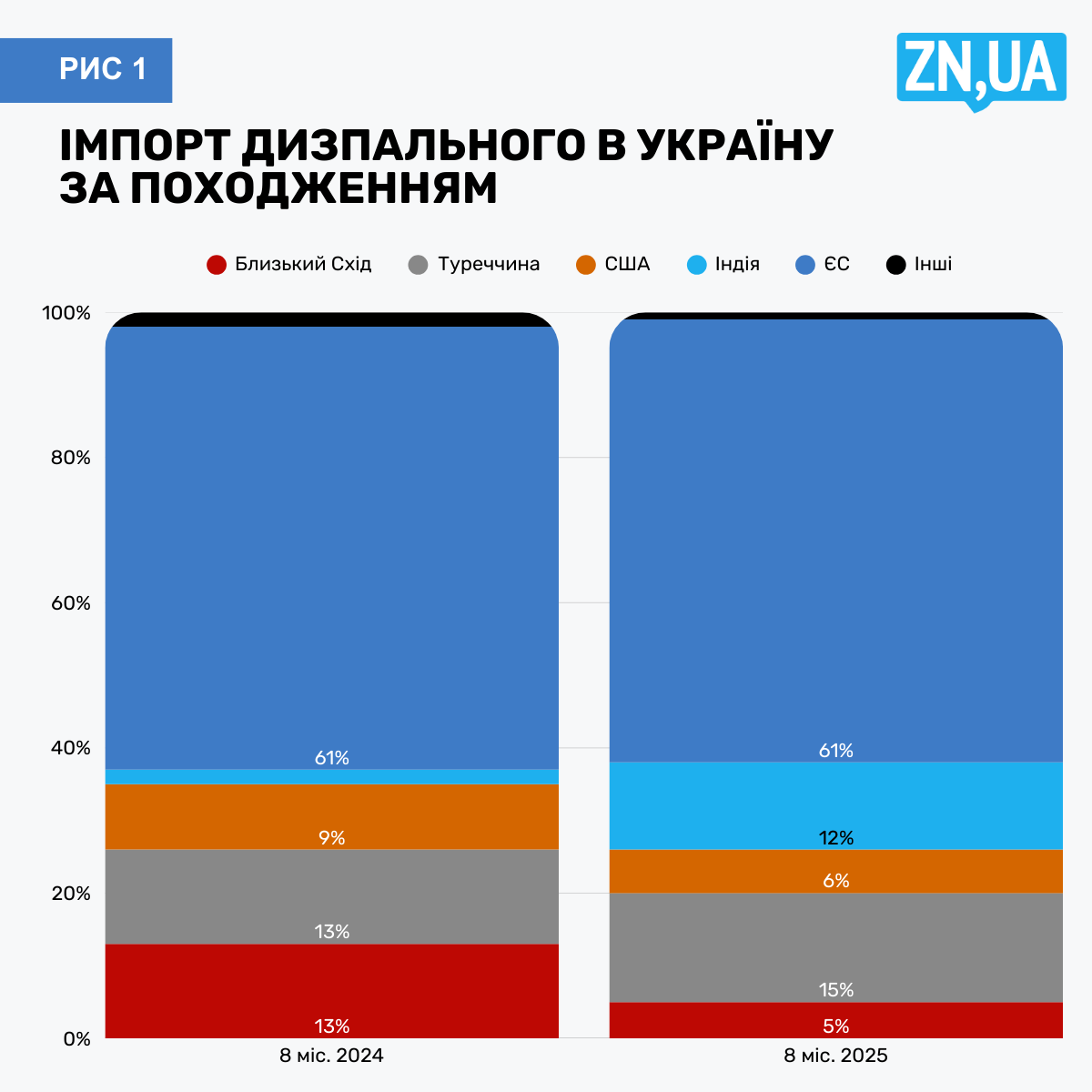 В Україну дизпальне надходить з усього світу: цього року на нашому ринку можна було зустріти продукт із 24 країн. ЄС залишається основним постачальником дизпального на український ринок. Порівняно з минулим роком його частка в загальному імпорті пального не змінилася, хоча деякі країни євроблоку суттєво скоротили постачання (див. рис. 1).