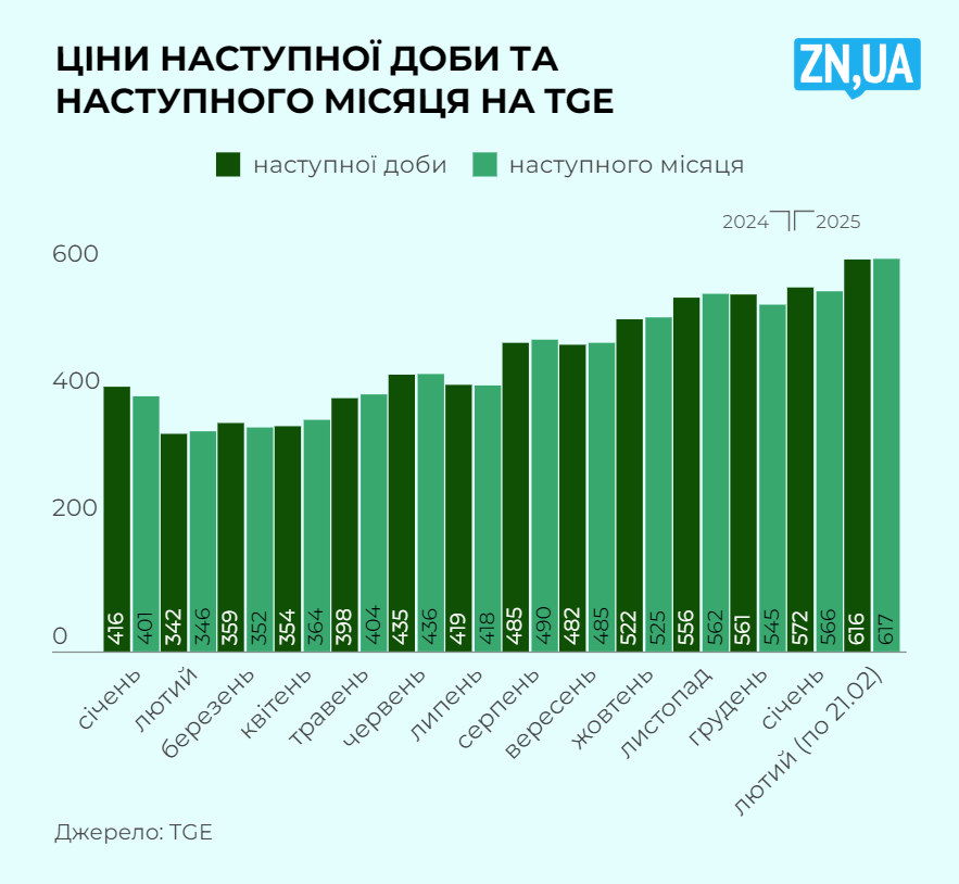 Якщо порівнювати з Україною, то ціна імпорту виглядає дещо вищою за ціни власного видобутку. Тарифи різних постачальників природного газу для непобутових споживачів з 1 лютого 2025 року коливалися від 490 дол. за тисячу кубометрів (далі — ткм) («Нафтогаз») до 830 дол./ткм (ТОВ «Гласкомерц»). На середину лютого цього року середня ціна березневих місячних поставок на Українській енергетичній біржі становила в еквіваленті 525 дол./ткм (із ПДВ, без плати за точку виходу з ГТС). На CEGH і TGE цього дня ціна дорівнювала близько 600 дол./ткм, разом із доставкою і тарифом точки входу в Україну — близько 630 дол.
