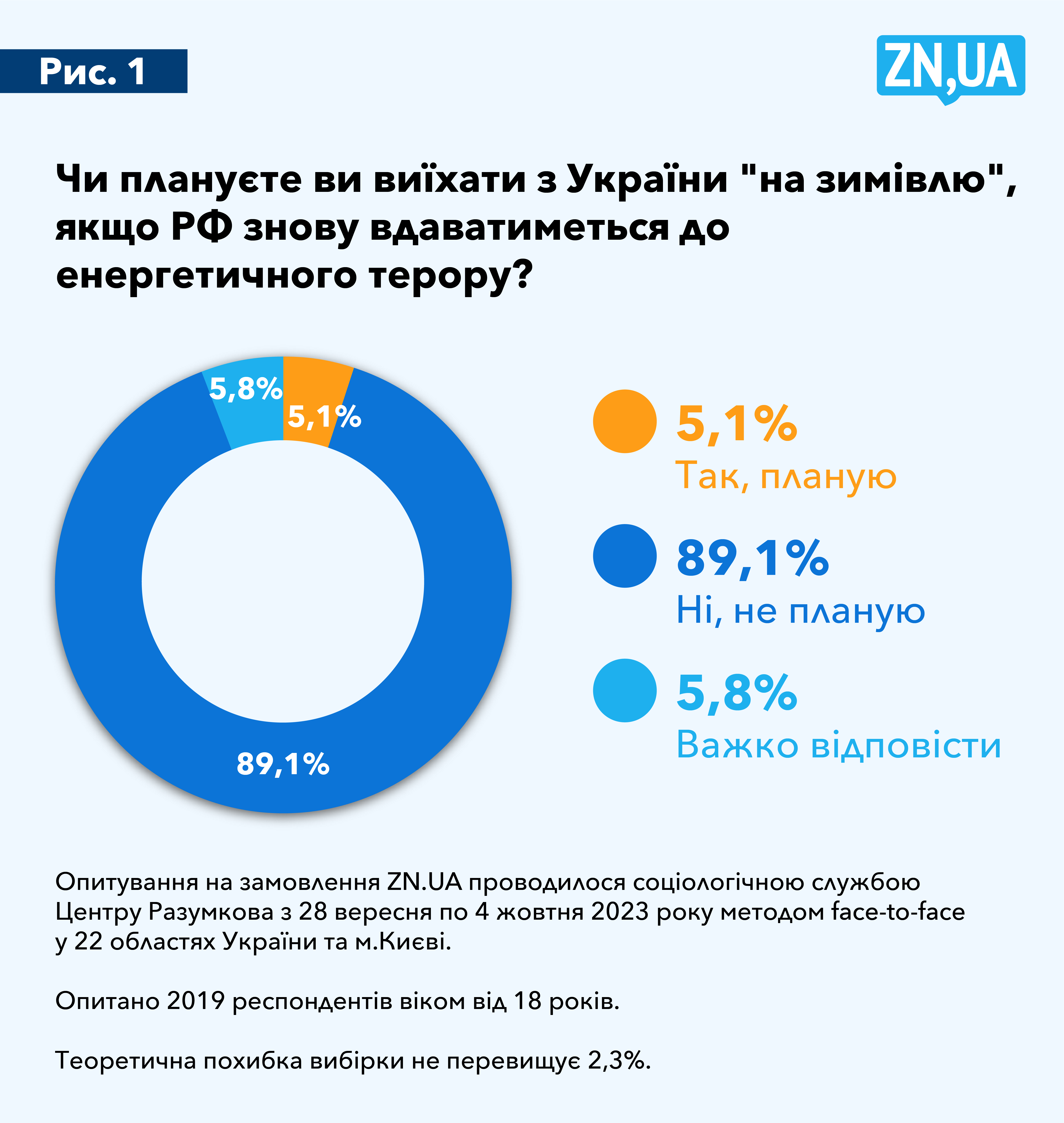 Заручившись допомогою соціологічної служби Центра Разумкова, ZN.UA запитало у українців, чи планують вони виїхати з України «на зимівлю», якщо РФ знову вдаватиметься до енергетичного терору? «Так» відповіли лише 5% респондентів, більшість (89%) обрали варіант «Ні», ще 5,8% — варіант «Важко відповісти». Люди, що досі не виїхали або вже повернулися, принаймні не прив’язують своїх міграційних рішень до наявності світла й опалення в оселях (див. рис. 1).