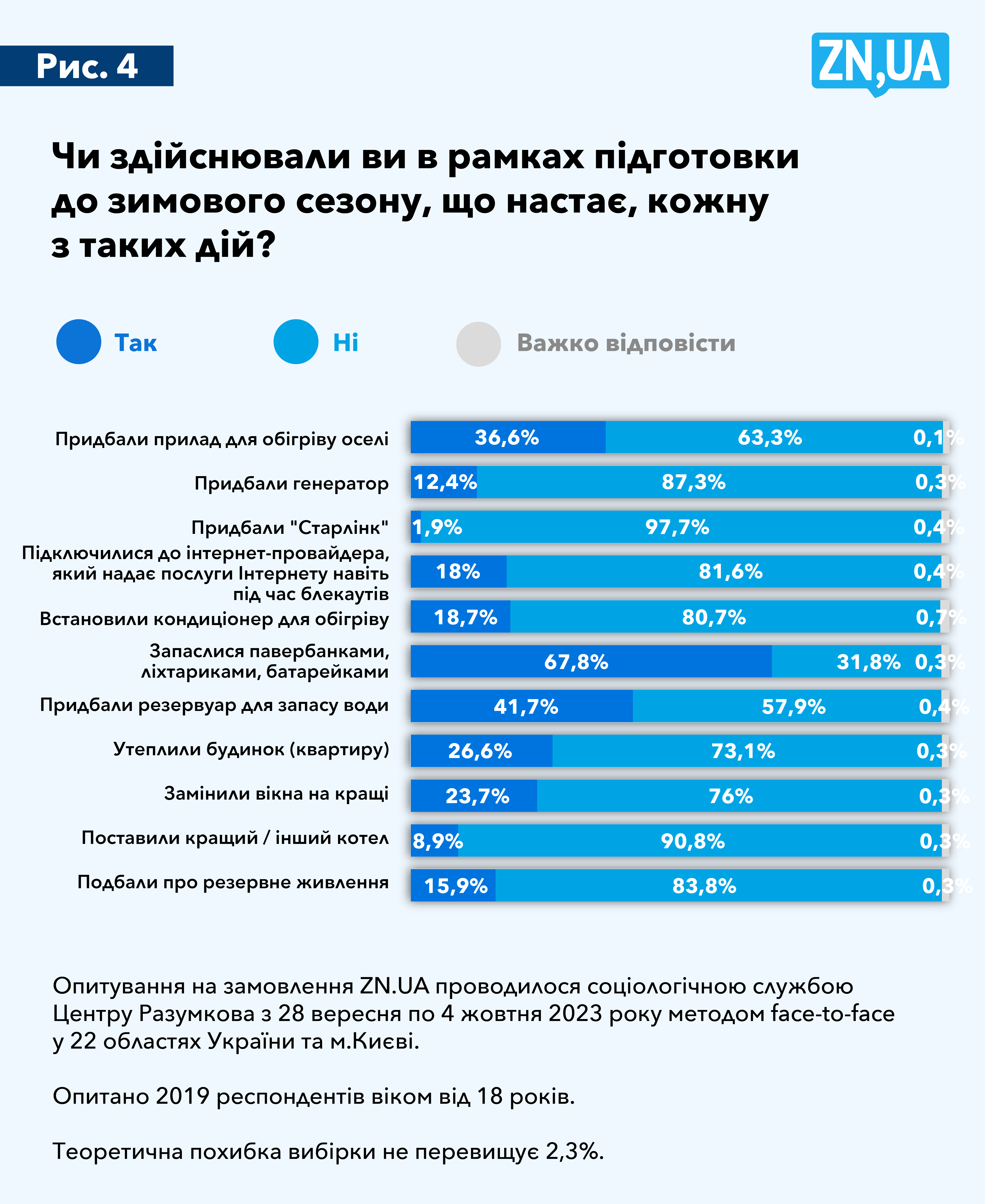 Тим не менш десь близько чверті опитаних усе ж зазначили, що провели мінімальну термомодернізацію: утеплили будинок (квартиру) до зими (26,6%) і замінили вікна на кращі (23,7%). Також 18,7% респондентів встановили для обігріву кондиціонер, 18% — перейшли до інтернет-провайдера, який надає послуги Інтернету навіть під час блекаутів, 15,9% — придбали прилад резервного живлення, 12,4% — придбали генератор, 8,9% — замінили котел на кращий. Лише 1,9% респондентів зазначили, що, готуючись до зими, придбали «Старлінк», що не дивує, зважаючи на вартість такої покупки.