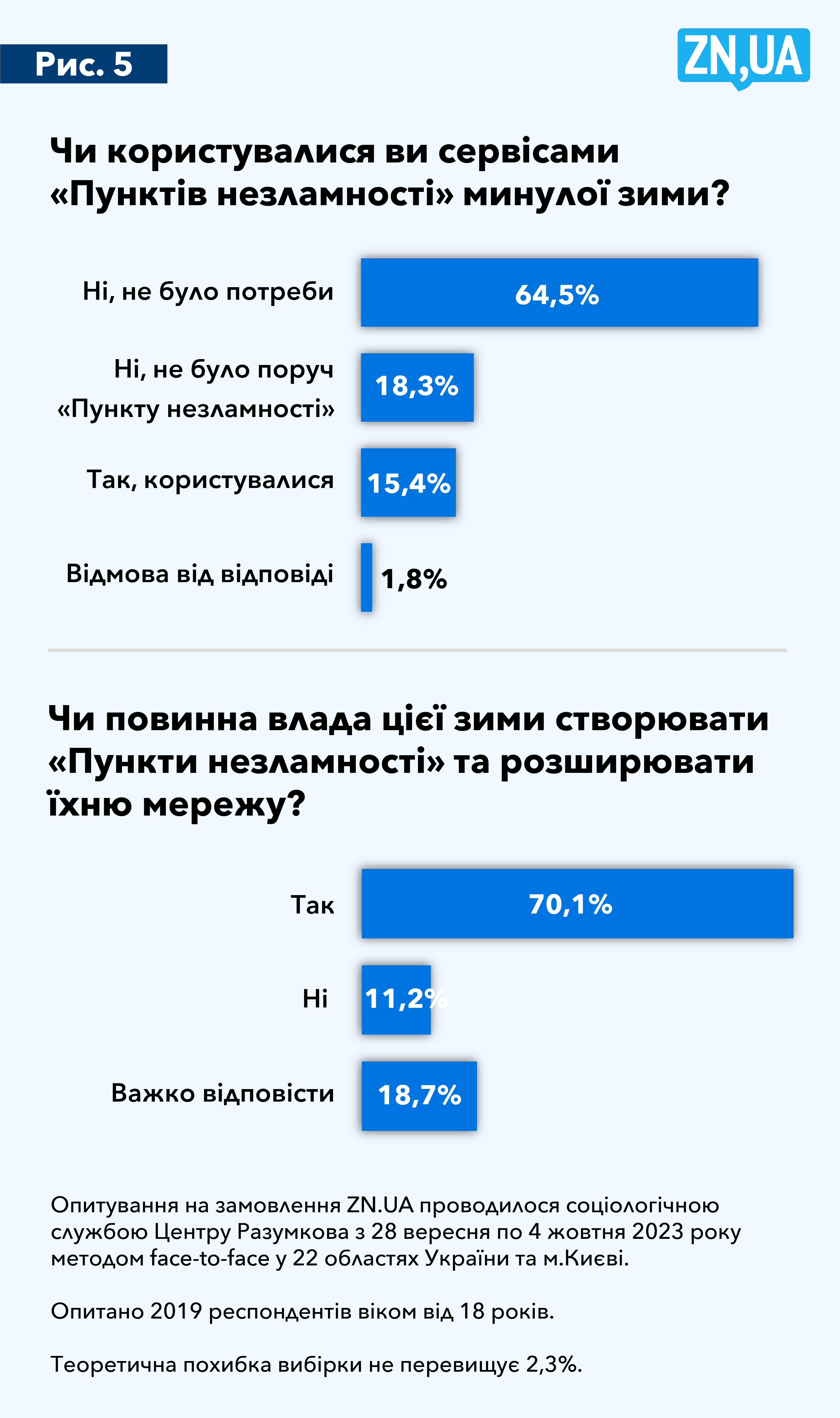 А от ставлення українців до «Пунктів незламності» відверто здивувало (див. рис. 5). З одного боку, 64,5% респондентів відповіли, що минулої зими не користувалися їхніми сервісами, бо не мали такої потреби. З іншого — 70% зазначили, що влада повинна цієї зими створювати «Пункти незламності» та розширювати їхню мережу. Втім, це типове українське «най буде» має сенс, адже шансів оминути дефіцит енергетичних потужностей у нас немає.