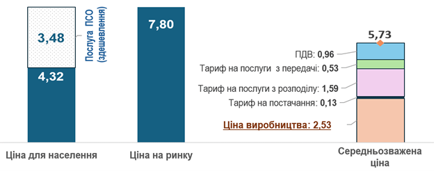 Тут треба акцентувати, що ціна виробництва електроенергії для «коктейлю» від «Енергоатому» та «Укргідроенерго» становить лише 2,53 грн/кВт⋅год, тоді як на ринку вона була втричі більшою — 7,80 грн. Слід розуміти, що останню ціну вказано без вартості транспортування, розподілу та постачання.