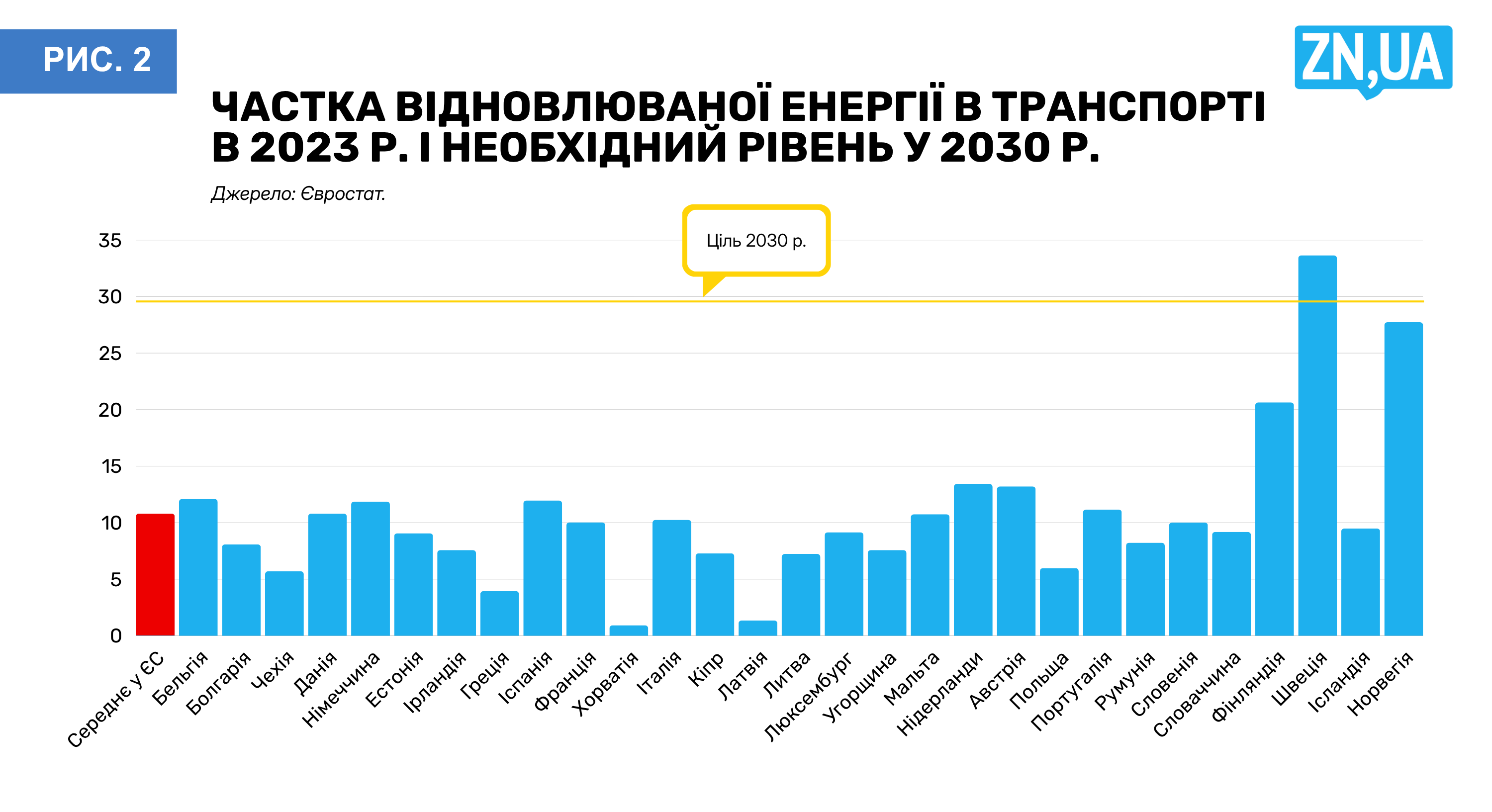 Ще глибшою є проблема на транспорті. 2023 року (свіжіших даних по ЄС ще немає) частка відновлюваної енергетики на транспорті становила лише 10,8%, що майже втричі нижче від плану на 2030 рік (див. рис. 2). Частка суто батарейних електрокарів (BEV) у країнах Східної Європи коливається в районі 0,5–2%, у Західній Європі наближається до 5–7%. Особняком стоять Скандинавські країни, що десятиріччями розвивали гідроелектричні станції і зараз мають стабільну зелену генерацію та надійні мережі.