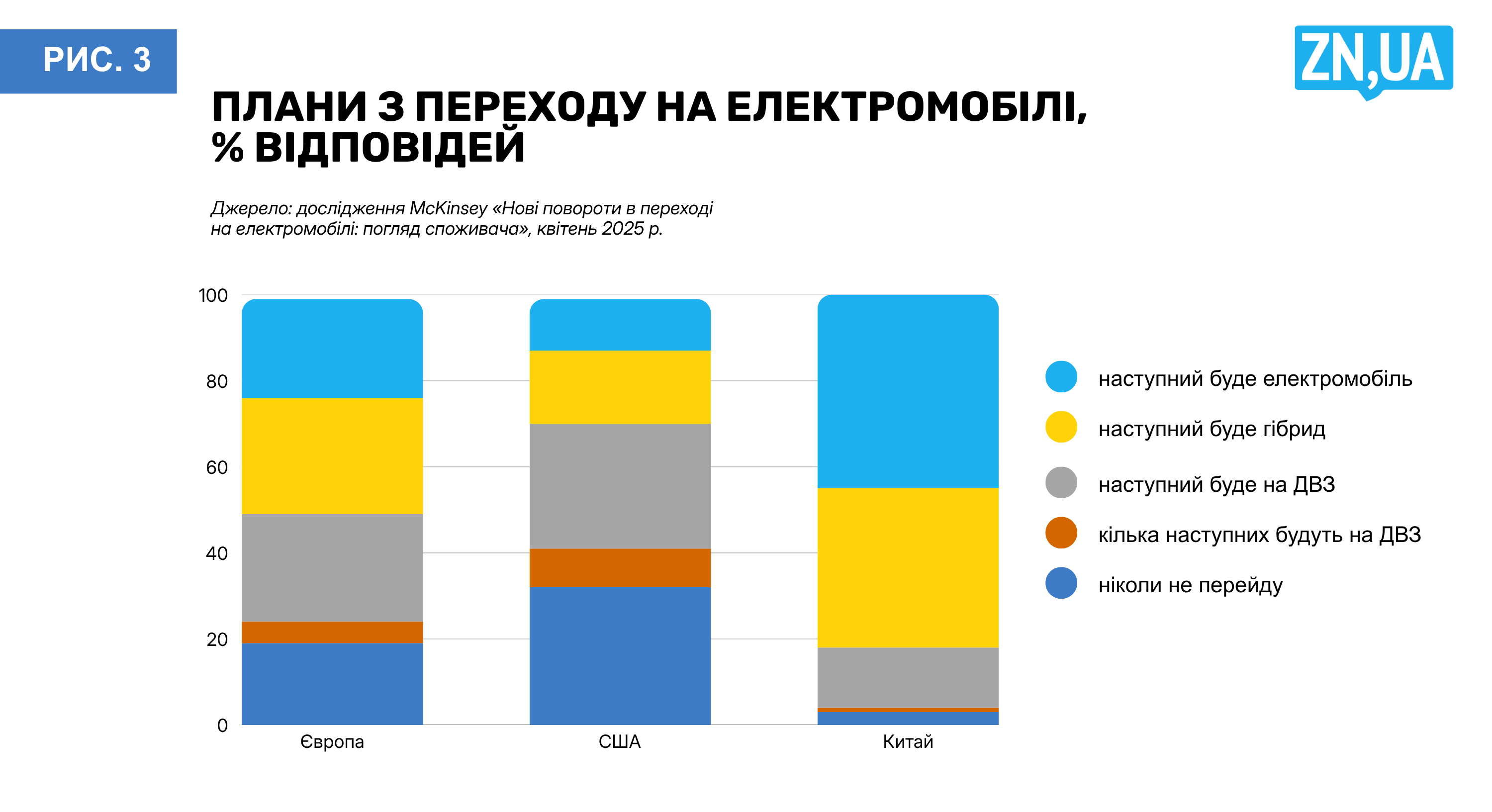 Сказати, що влада ЄС активно просуває зелені технології в маси, також не можна. Якщо економічні двигуни внутрішнього згоряння (ДВЗ) завжди користувалися потужними PR-програмами, то «електрички» так активно не просуваються. Згідно з опитуванням у квітні 2025 року, близько половини населення ЄС не вбачає себе власником EV у найближчій перспективі (див. рис. 3). Показові результати США, де 32% респондентів заявили, що ніколи не пересядуть на електромобіль. Геть інша картина в Китаї — 45% опитаних куплять наступний автомобіль повністю електричний.