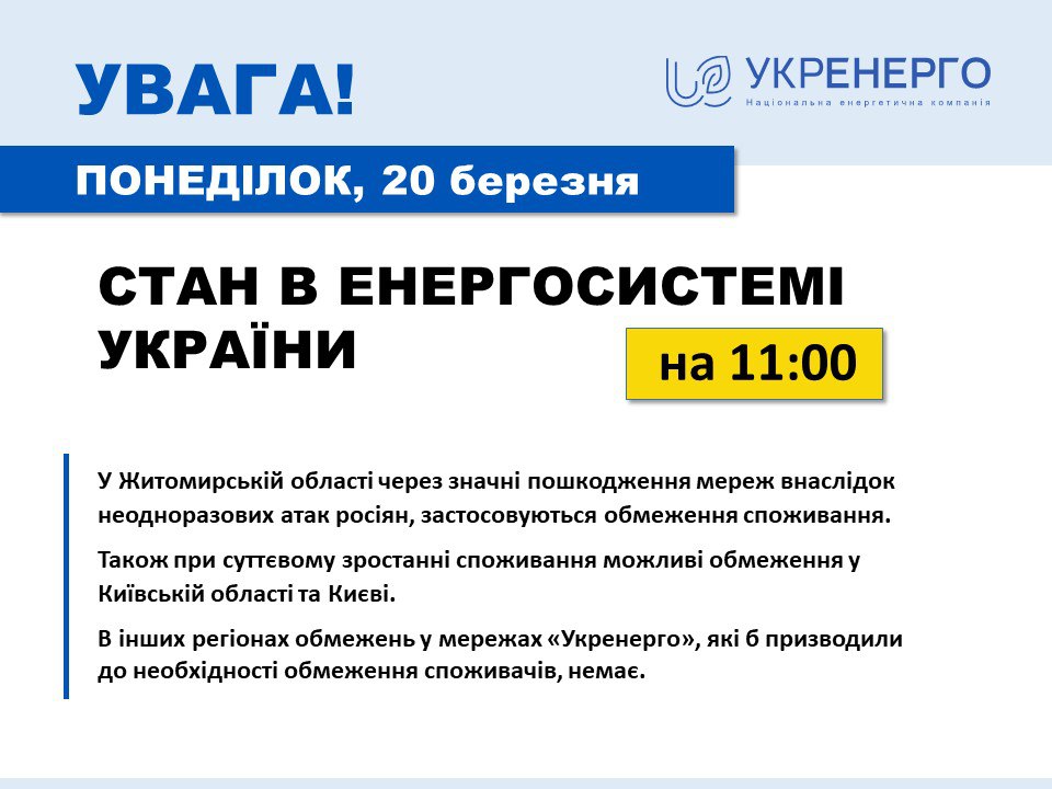 У Житомирській області через значні пошкодження мереж у понеділок, 20 березня, застосовуються обмеження споживання електроенергії. Також при значному зростанні споживання можливі обмеження у Київській області та Києві, повідомили в НЕК «Укренерго».