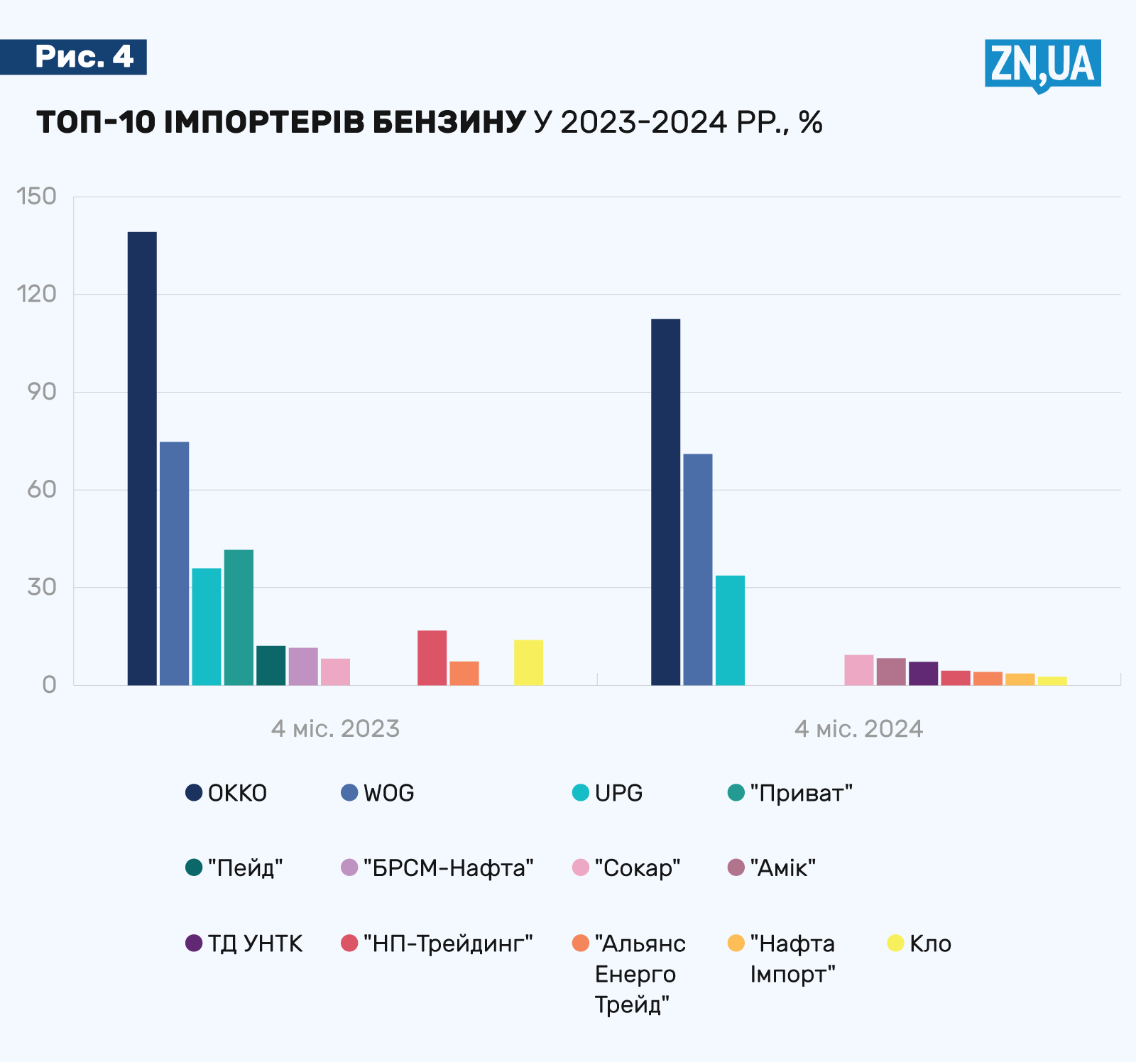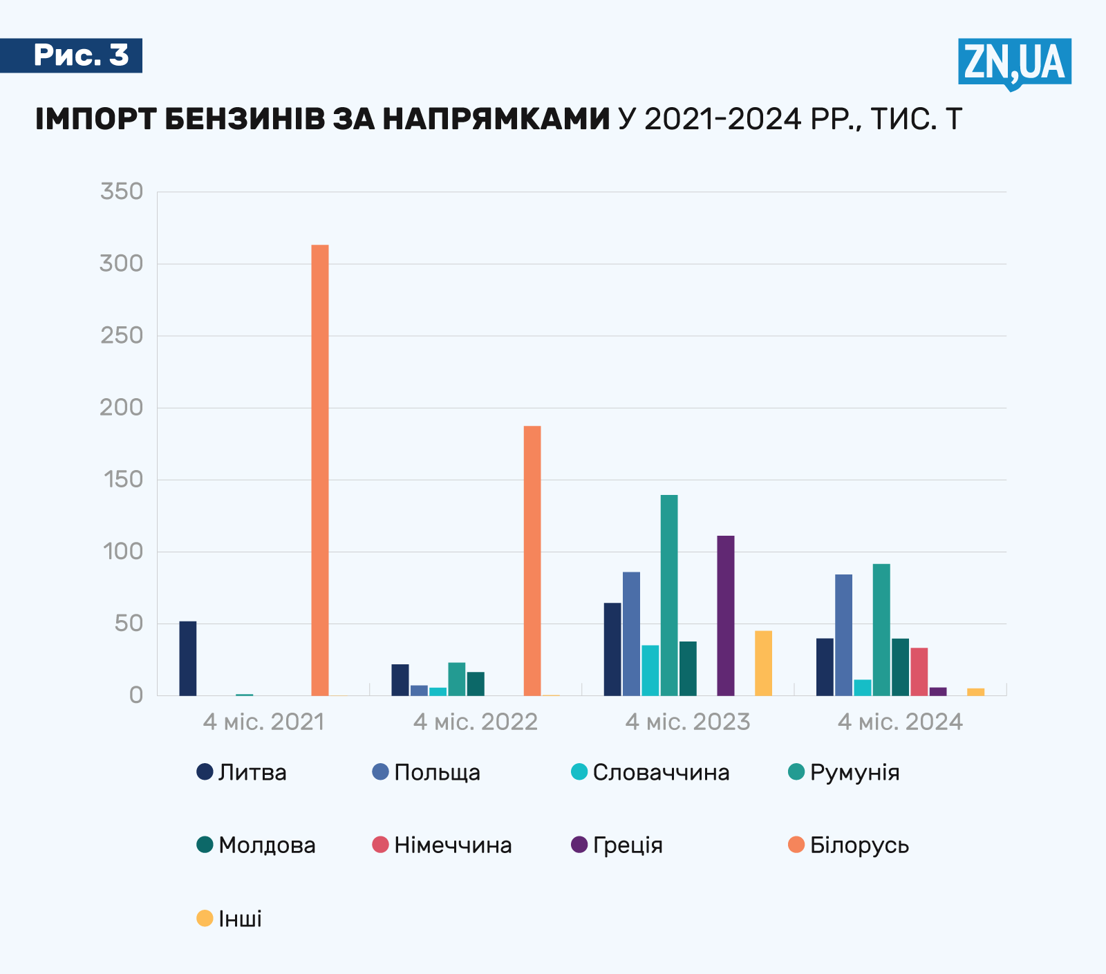 Основна конкурентна боротьба точиться на ринку саме дизпального — наймасовішої позиції у споживанні України. За чотири місяці 2024 року було імпортовано 2,03 млн тонн. Що характерно, це більше не тільки за показники минулого року (на 2%), а й за імпорт 2021-го — майже на 14%.