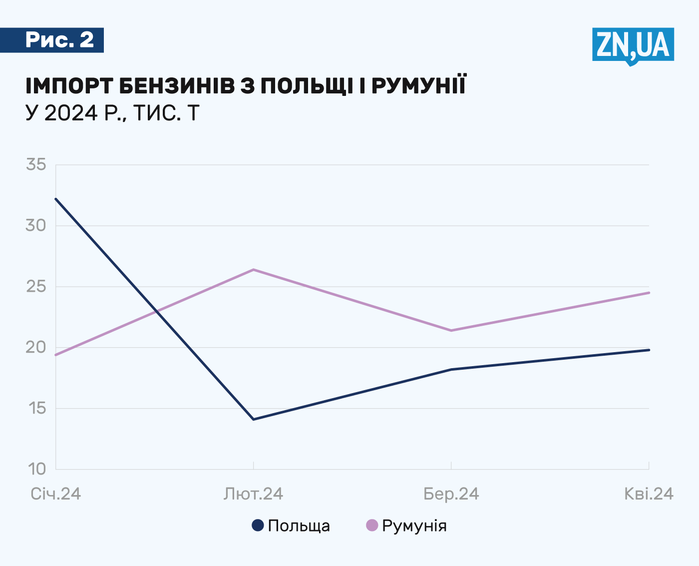 Другим напрямком постачання бензину є Румунія — основний конкурент поляків і литовців (див. рис. 2). Тут відбувається справжнє змагання між західним і південним напрямками імпорту, яке стає дедалі цікавішим. Будь-яка помилка або проблема на заході одразу знаходить відповідь із півдня.