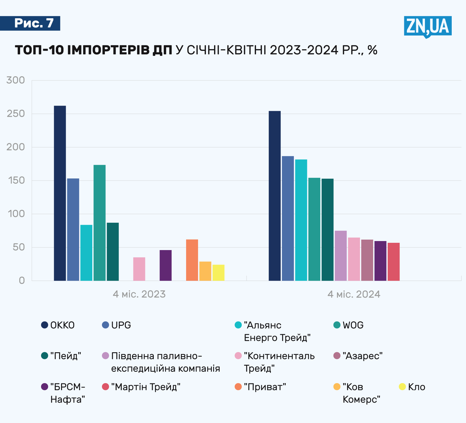 Рейтинг найпотужніших імпортерів дизпального має відмінності від рейтингу імпортерів бензину. Це ОККО, UPG та оптовий трейдер «Альянс Енерго Трейд».