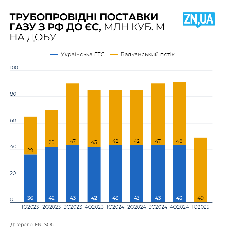 А що ж у РФ? Росія не змогла компенсувати втрати українського транзиту через збільшення експорту іншими маршрутами. Так, є незначне його збільшення через європейську гілку «Турецького потоку», але сумарний обсяг трубопровідних поставок газу з Росії до ЄС у першому кварталі 2025 року був на 42% нижчим, ніж у першому кварталі 2024-го.
