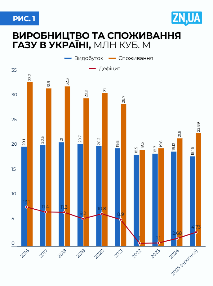 Наприклад, в останній довоєнний 2021 рік споживання становило 28,7 млрд кубометрів газу, а власний видобуток — лише 19,8 млрд.