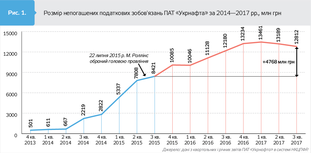 Питання подовження ліцензій упирається в податковий борг, який керівництво "Укрнафти" називає "історичним", хоча за час роботи Роллінса він виріс наполовину (див. рис. 1). "Укрнафта" і Державна фіскальна служба не можуть зійтися в оцінках боргу: Марк Роллінс називає цифру 11,8 млрд грн, ДФС - 13,9 млрд.