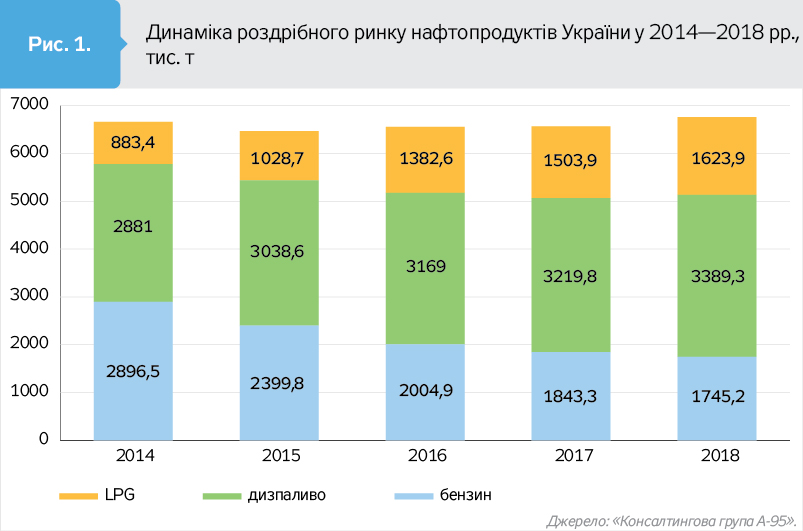 За оцінками "Консалтингової групи А-95", обсяг роздрібного ринку збільшився 2018-го на 2,9%, до 6,75 млн т. Порівняно з "дном" 2015 р. зростання становило 4,5%. Драйвери зростання - скраплений газ і дизельне паливо, продажі яких підвищилися на 8 і 5,3% відповідно. Продовжив падіння бензин - на 5,6% (див. рис. 1).