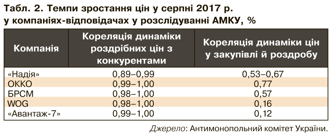 Головна зачіпка Комітету - чіткий збіг темпів динаміки оптових і роздрібних цін у кризовий період (друга половина серпня) на тлі різних темпів зростання закупівельних цін. Таку претензію пред'явлено всім оштрафованим фігурантам справи. Темпи зростання на АЗС корелювали з точністю 98–100%, тоді як діапазон закупівельних цін виявився набагато ширший (див. табл. 2).