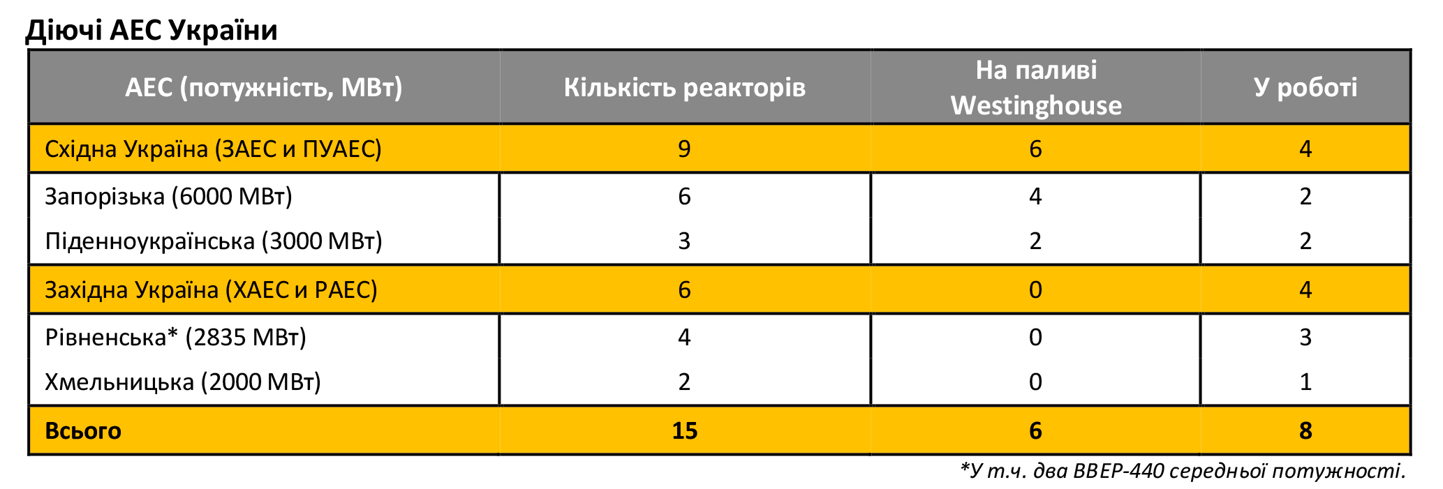І головне, найближчим часом доведеться терміново змінювати постачальника палива. Робота з російським «ТВЕЛ» після початку війни вже неможлива. А росіяни поставляли паливо на сім великих реакторів ВВЕР (з 13 наявних) і на два меншого розміру ВВЕР-440 на Рівненській АЕС. Тільки шість були на американському паливі Westinghouse (див. табл.).