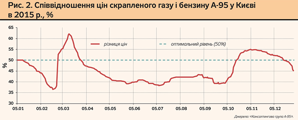 "Золоте правило" автогазу каже, що його ціна не має перевищувати 50% ціни бензину. Тому коли в Україні в окремих регіонах відношення опускалося часом до 35%, успіх газу був забезпечений (рис. 2).