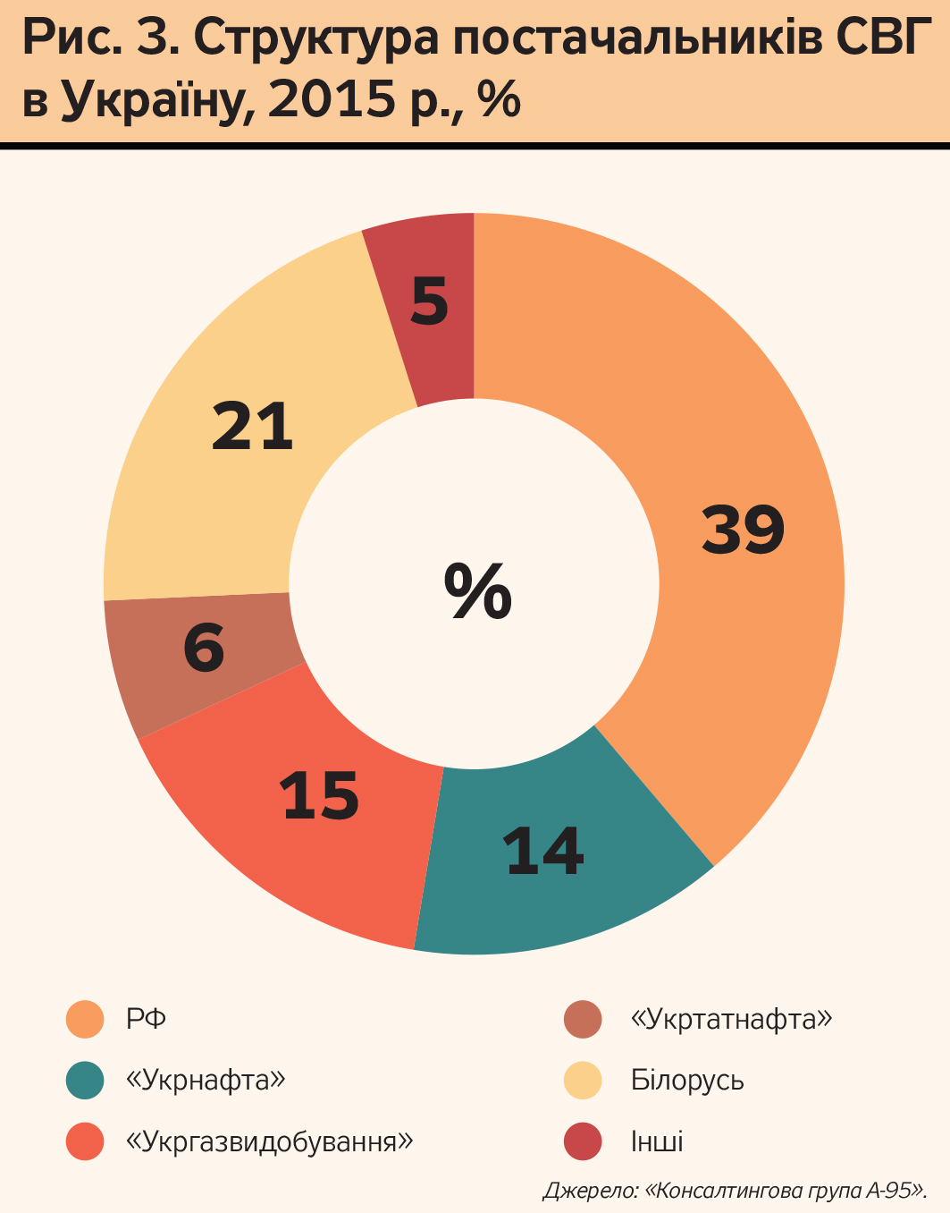 Останні роки характеризуються падінням вітчизняного виробництва газу, і 2015-й не став винятком. І якщо "Укрнафта" утримала падіння виробництва СВГ у рамках 6% (до 154,15 тис. т 2015-го), то "Укргазвидобування" опустила цей показник до 13% (до 172,63 тис. т). Уже дев'ятий рік поспіль зростаючий попит на СВГ задовольняють імпортні поставки. За підсумками 2015 р. на імпорт припадає понад 63%, а в пікові місяці його частка перевищувала 70%. Основні джерела постачання ринку поки що залишаються в РФ і Білорусі. Ще у 2014 р. обігнавши за обсягами найбільшого українського виробника - "Укргазвидобування", росіяни 2015-го активізувалися, збільшивши поставки СВГ на 53%. Завдяки такому зростанню частка росіян на українському ринку підвищилася з 30% у 2014-му до майже 40% у 2015-му (рис. 3).