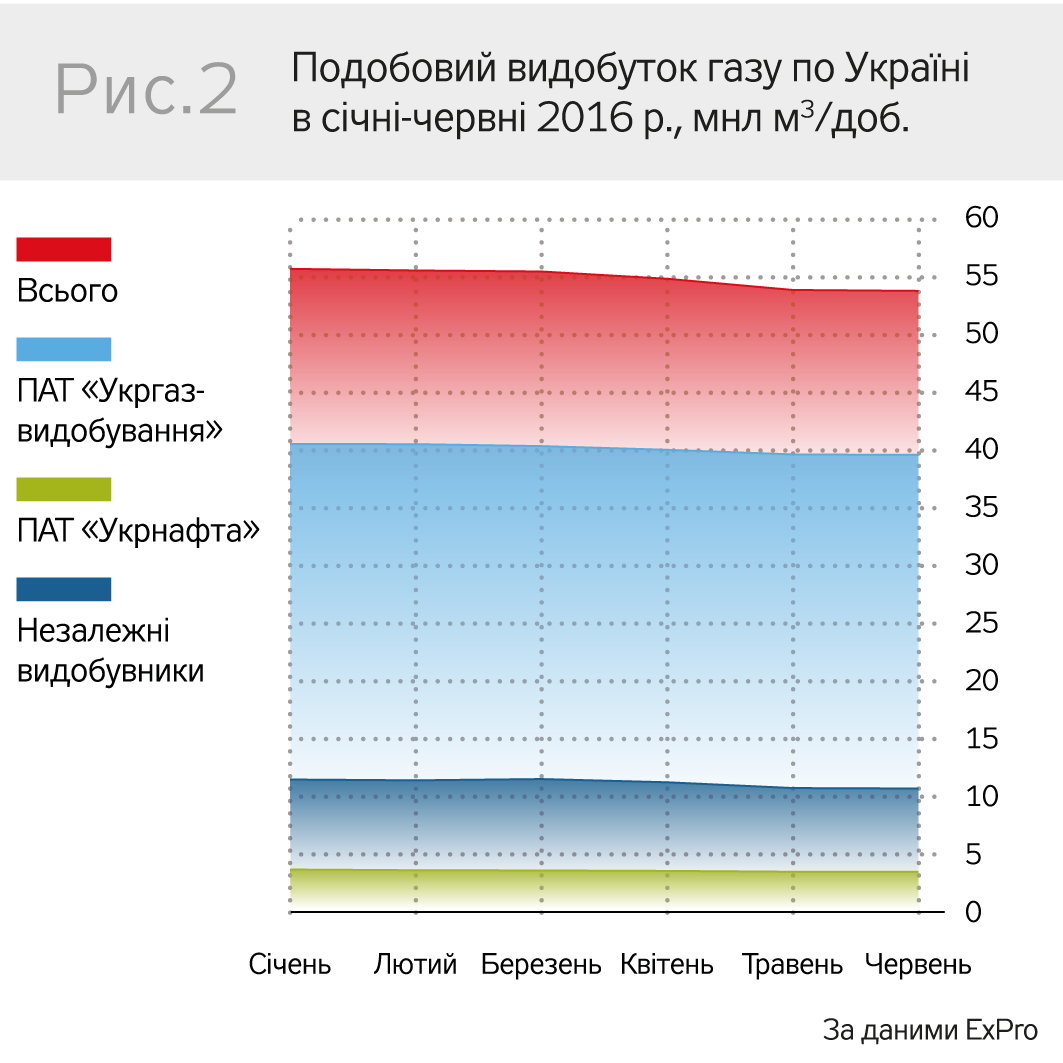 Сьогодні у газодобувному секторі України спостерігаємо дві тенденції. По-перше, стабілізація видобутку монополіями "Укргазвидобування" і "Укрнафта". Поки що йдеться не про зростання, а тільки про призупинення падіння. По-друге, зниження темпів приросту у приватному секторі. Так, у 2014 р. видобуток приватних компаній збільшився на 27%, у 2015 р. - на 17, у першому півріччі 2016-го - на 14%. Причому в червні приватні компанії збільшили видобуток лише на 9%.
