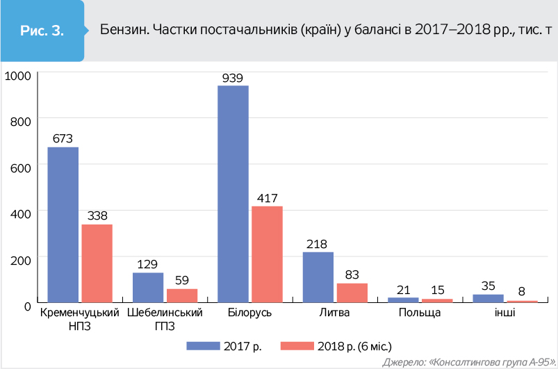 В Україні на сьогодні працюють два виробники нафтопродуктів - Кременчуцький нафтопереробний завод (НПЗ) "Укртатнафта", контрольований групою "Приват" Ігоря Коломойського, і Шебелинський газопереробний завод (ГПЗ) держкомпанії "Укргазвидобування" (входить до групи НАК "Нафтогаз України"). Рівноцінними ці підприємства назвати не можна: за підсумками першого півріччя 2018-го, перший завод займав 36% ринку бензину й 11,5% ринку дизпалива, другий - 6,4 і 1,5% ринку відповідно. Як бачимо, позиції за бензином більш ніж упевнені, але цього недостатньо (див. рис. 1).