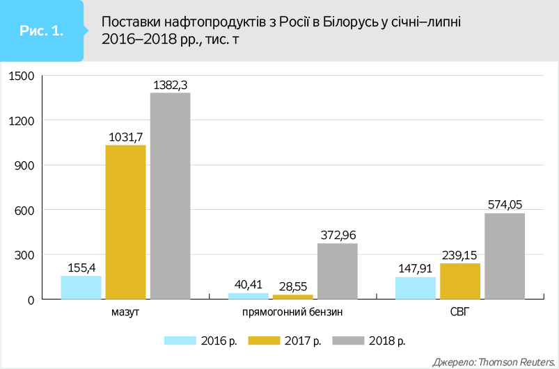 Улітку 2018 р. з боку РФ назріло нове невдоволення щодо реекспорту палив повз російський бюджет. Приводом для занепокоєння російської сторони стало стрімке зростання поставок нафтопродуктів у Білорусь. Основні претензії стосувалися мазуту. За даними агентства Thomson Reuters, за сім місяців 2018 р. Білорусь імпортувала 1,4 млн т мазуту проти 1 млн т за такий самий період 2017-го й 155 тис. т за сім місяців 2016 р. (див. рис. ). У Мінфіні РФ заявили, що цей мазут був експортований, а мита на шкоду російському бюджету були сплачені до білоруського. Особливо засмучує російський Мінфін те, що мито на експорт низькорентабельного мазуту з 2017 р. порівнянне з митом на високорентабельну нафту.