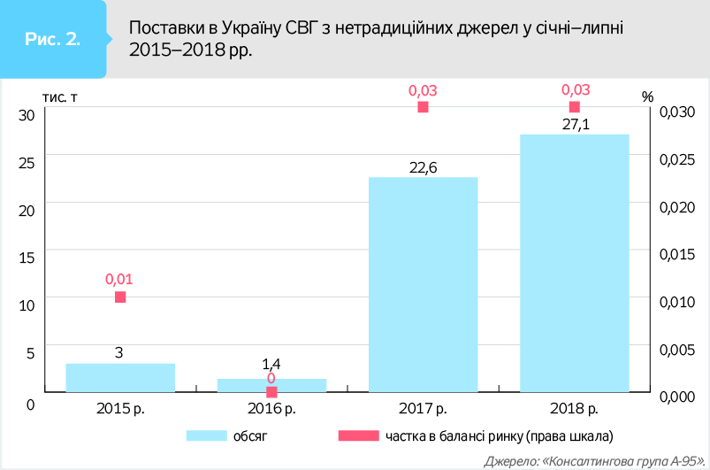 СВГ на західному кордоні й у морі, як правило, відчутно дорожчий від білоруського або російського. Проте поставки з альтернативних джерел потроху зростають - сточуються юридичні й інфраструктурні аспекти, роблячи закупівлю більш простою й оперативною. Серед країн-сухопутних постачальників у 2017 р. - Польща, Литва, Румунія. І хоча на нетрадиційні джерела припадає поки що 2,7% від споживання, їхній вплив на західні й південні регіони вже досить великий (рис. 2).