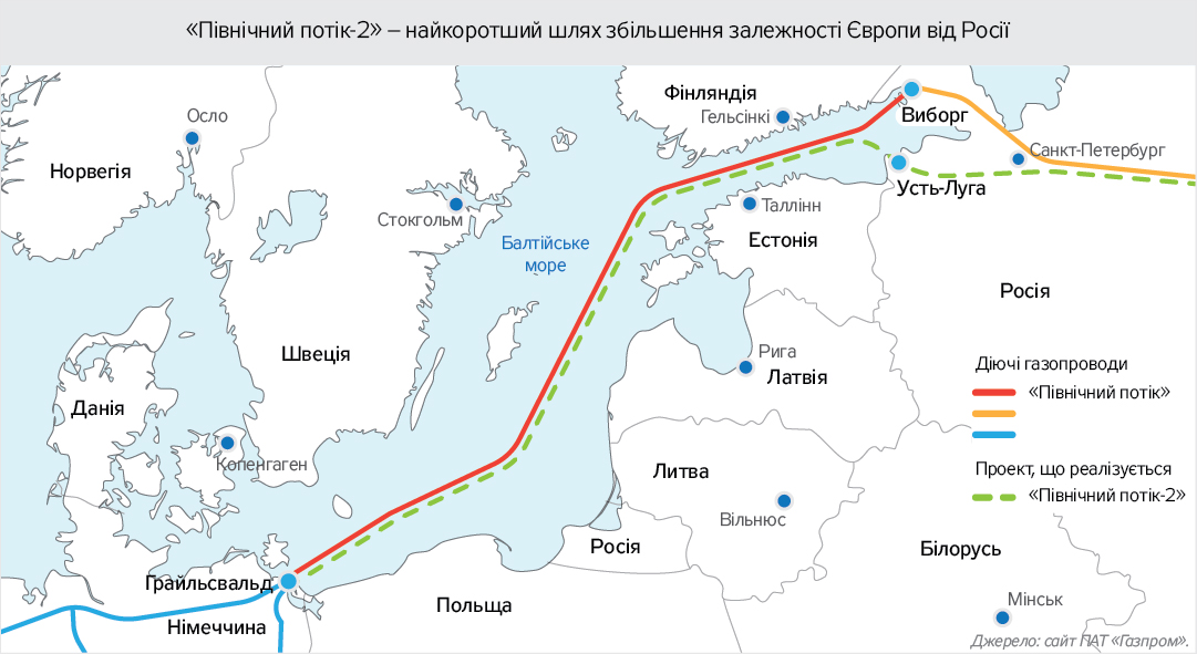 Видима мета цієї війни - обійти Україну й Польщу газопроводами і позбавити нашу країну транзиту газу та доходів від нього (2–3 млрд дол. на рік) - стала однією з ключових у геополітиці путінської Росії. Але й це не головне, хоча "Північний потік-1" (ПП-1), будівництво якого було завершене у 2011 р., з моменту введення в експлуатацію поступово й успішно відбирав в України щорічно частину транзитного газу, аж до 55 млрд кубометрів в останні роки. "Газпром" має намір диктувати Європі свої правила гри й забезпечити законність свого статусу як продавця, так і оператора газопоставок, що суперечить європейському енергетичному та конкурентному законодавству.