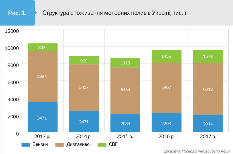 Через кризу 2014–2015 рр. споживання знизилося на 16%, або 1,7 млн т нафтопродуктів, переважно бензину. Але вже до 2016 р. обсяги приросли майже на 1 млн т дизпалива (ДП) і скрапленого газу (СВГ), а 2017-го ще трохи збільшилися (див. рис. 1).