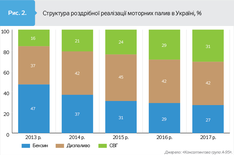 Зміни кошика моторних палив наближаються до завершення: у 2017 р. приріст обсягів газу становив 8%, тоді як у 2016 р. було 30%. Схоже, усі, хто хотів і міг перейти на газ, уже зробили це, і тепер усе залежатиме від інтенсивності їхньої їзди. На бензині залишилися ті, хто не зміг перейти на газ технічно, і ті, для кого ціна не має великого значення.