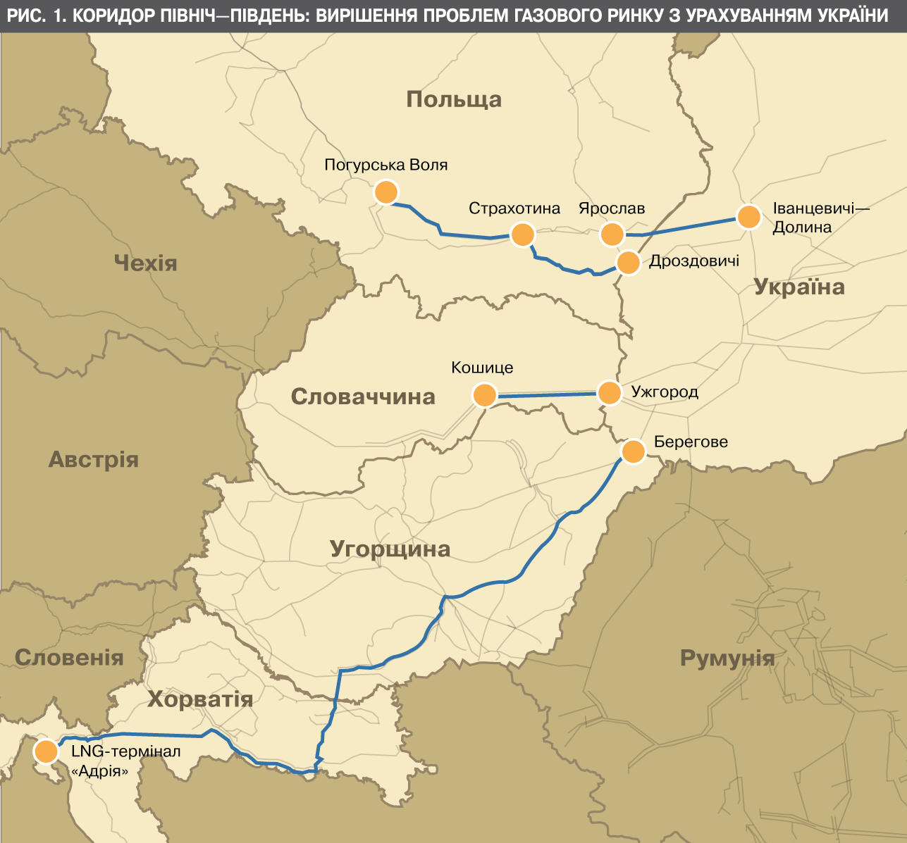 Наші найближчі європейські сусіди - Польща та Угорщина - готові включити Україну в маршрути європейського газового коридору Північ-Південь (див. рис. 1). І як потужного оператора ГТС, і як перспективного партнера та учасника Європейського Енергетичного співтовариства.