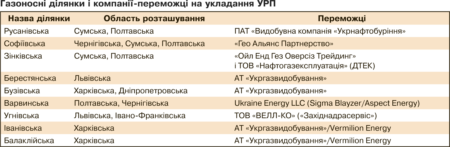 Слід зазначити, що відбір переможців конкурсів по дев'яти УРП пройшов винятково дипломатично. Міжвідомча комісія з відбору переможців УРП вирішила роздати "всім сестрам по сережках". З дев'яти конкурсів державна компанія "Укргазвидобування" отримала найбільше ділянок - дві самостійно та дві у партнерстві з канадською Vеrmilion Energy, ще по одній ділянці отримали "Гео Альянс Партнерство" (підконтрольна Віктору Пінчуку), "Ойл Енд Гез Оверсіз Трейдинг"/ТОВ "Нафтогазексплуатація" (структури ДТЕК Ріната Ахметова), Ukrainіan Energy LLC (Sigma Blayzer/Aspect Energy), ТОВ "ВЕЛЛ-КО" (структура "Західнадрасервіс" Зиновія Козицького) та "Укрнафтобуріння" (власники - Ігор Коломойський і Віталій Хомутиннік).