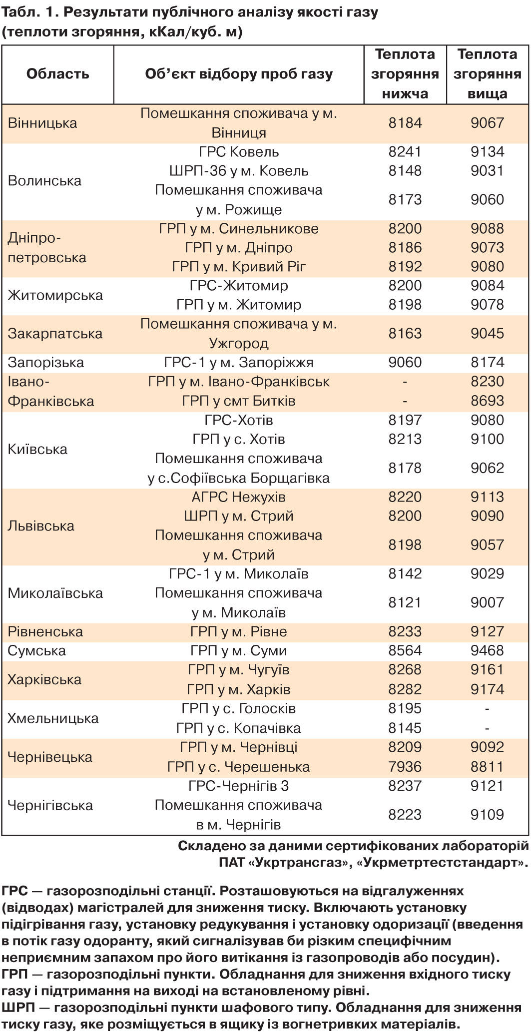 8500 ккал/куб. м. Така різниця пояснюється саме тим, що до споживачів надходить газ із різних джерел видобування - вітчизняних або іноземних. Дані за регіонами наведено у табл. 1.