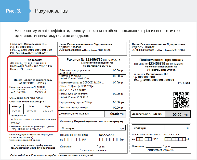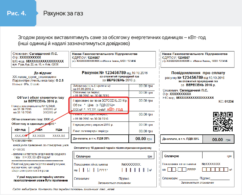Квитанція за газ виглядатиме, як на рис. 3 і 4 (див. на сайті DT.UA). Спочатку це робитиметься для того, щоб громадяни вивчили, як теплота згорання обсягу газу перераховується у кіловат-години, гігакалорії і мегаджоулі. З часом газопостачальні компанії мають намір обліковувати обсяг спожитого газу в енергетичних одиницях - у кіловат-годинах. Поки це можлива перспектива, але з часом вона може стати реальністю.