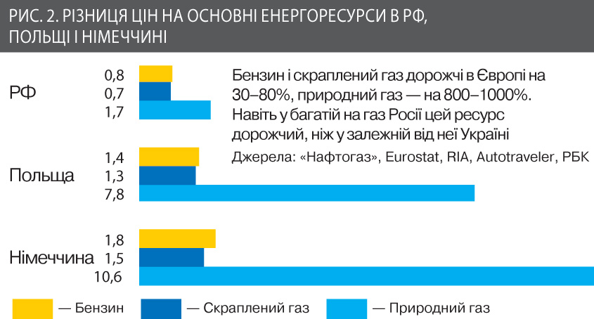 Розглянемо за категоріями. Що стосується населення, то ціни в цьому сегменті споживання в нас залишаються рекордно низькими. Дешевше, ніж у Росії, не кажучи про країни Східної Європи, які давно пройшли цей шлях. Особливо показове порівняння ціни на газ та інші енергоносії. Наші споживачідавно звикли до ринкової ціни бензину та пропан-бутану, але метан (той самий природний газ, що йде по трубах) відстає кардинально (див. рис.1).