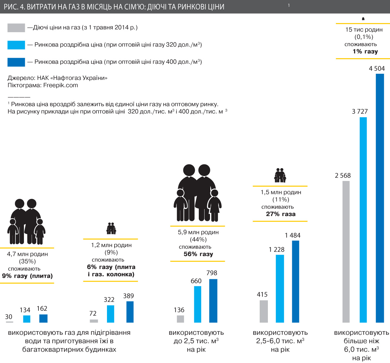 Інший приклад. В Україні майже 5 млн домогосподарств, які в містах споживають газ із конфорок, оплачуючи близько 30 грн на місяць. Це кожен третій споживач газу, призначеного для населення. Якщо реалізувати наші пропозиції, то витрати одного домогосподарства на газ зростуть до 134–162 грн на місяць (див. рис. 4). Це менше, ніж витрати середньої сім'ї на такі статті, як мобільний зв'язок, алкоголь чи тютюн. Є аспект соціальної справедливості: в Україні чимало домогосподарств у віддалених негазифікованих районах - не найбільш заможне населення. Вони змушені використовувати скраплений газ, пропан-бутан, та їхні середньомісячні витрати на купівлю газу в балонах на приготування їжі вже давно перевалили за 170 грн на місяць. Виходить, що низькими тарифами на природний газ із труби ми дискримінуємо цю категорію споживачів, котрі, як правило, і є найменш захищеними. При цьому решті, включаючи й небідне населення міст, ми цей газ практично даруємо. Недозволена марнотратність.
