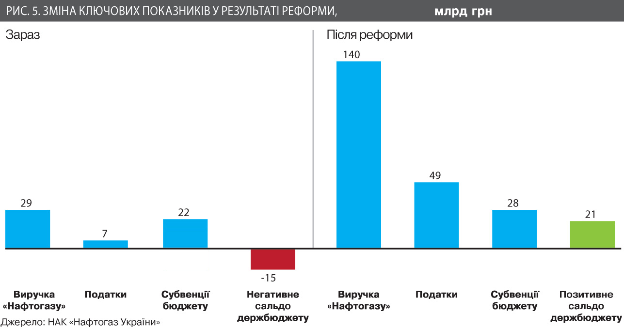 Тут доречно буде згадати про механізм пільг і субсидій, який компенсує всі витрати малозабезпечених споживачів вище за певний рівень. Ми усвідомлюємо, що після зростання цін кількість звернень за субсидіями збільшиться й витрати бюджету зростуть. Проте бюджет перестане витрачати десятки мільярдів гривень на підтримку "Нафтогазу" і почне, навпаки, одержувати гроші. За нашими розрахунками, якщо всі, хто має право на субсидію, звернуться по неї, то бюджет все одно залишиться із прибутком. Йдеться про додатне сальдо для бюджету на 36 млрд грн на рік (!) (див. рис. 5). Ці гроші держава одержить у вигляді додаткових податків (ренти, ПДВ, податку на прибуток) і зможе витратити на фінансування енергоефективності, що в результаті приведе до зниження обсягів споживання газу, а відповідно, до подальшого зменшення витрат споживачів.