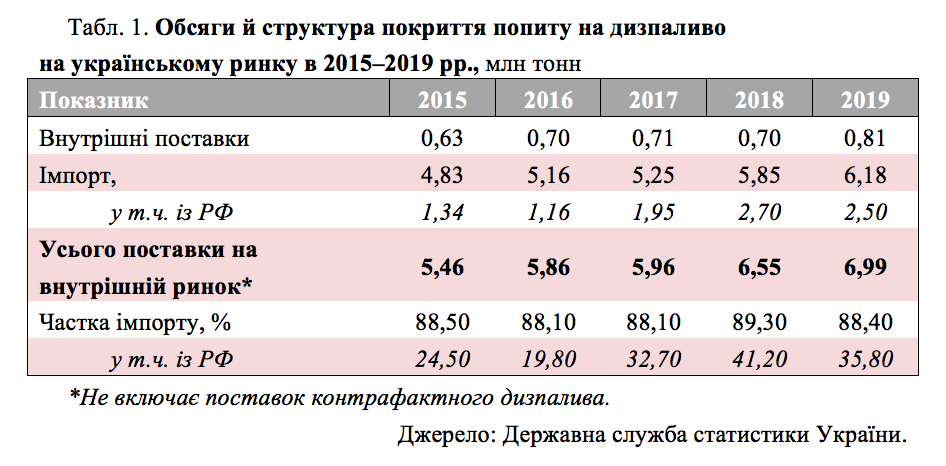 Основний постачальник дизпалива в Україну - Росія - протягом 2015–2018 років удвічі наростила поставки дизпалива в Україну (з 1,34 млн до 2,7 млн тонн), збільшивши свою частку на ринку за цей час із 24,5 до 41,2%. У 2019 році обсяг поставок з РФ дещо скоротився (до 2,5 млн тонн), але її частка на ринку все одно залишається значною - 35,8%. Згідно з Енергетичною стратегією України, це перевищує допустиме значення - 30% поставок енергоресурсів з одного джерела.