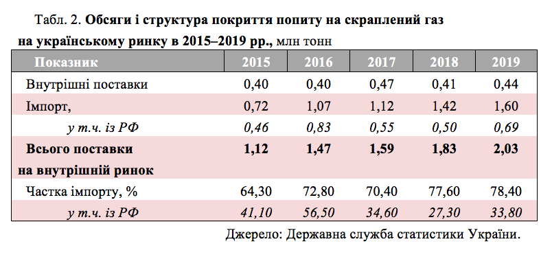 У сегменті скрапленого газу на Росію також припадає значна частка внутрішнього ринку, і обсяг її поставок зріс із 0,46 млн тонн 2015 року до 0,69 млн тонн 2019-го. За результатами 2019 року, частка Росії на ринку СГ (33,8%) також перевищує критичний показник у 30%.