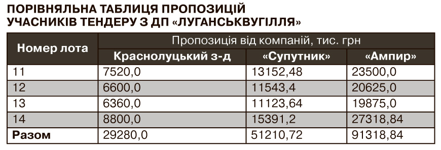 Як вимиваються гроші державного бюджету, розповімо на прикладі одного тендера. Державне підприємство "Луганськвугілля" одержало "рядок у держбюджеті" на реконструкцію обладнання однієї із шахт. Підтримка гірників - справа свята, тож війна - не війна, а тендери на проведення цих робіт, як кажуть, must go on. ДП "Луганськвугілля" 19 травня 2014 р. розмістило оголошення про проведення такого тендера. Ішлося про ремонт і технічне обслуговування машин та обладнання спеціального призначення, і в результаті на відкриті торги подали заявки кілька учасників. Для зручності подамо їх пропозиції у вигляді порівняльної таблиці. Слід пояснити, що за кожним із лотів надаються послуги або поставляється продукція однакового обсягу та якості.