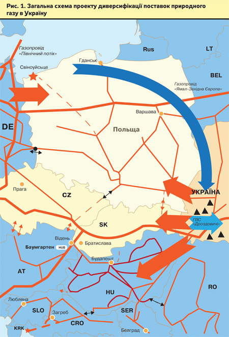 Ідея запропонованого об'єднавчого інфраструктурного проекту полягає в створенні нових можливостей доступу України до найбільш ліквідних торговельних майданчиків Північно-Західної Європи та "залученні" ряду західноукраїнських ПСГ у загальноєвропейську мережу зберігання природного газу (див. рис. 1).