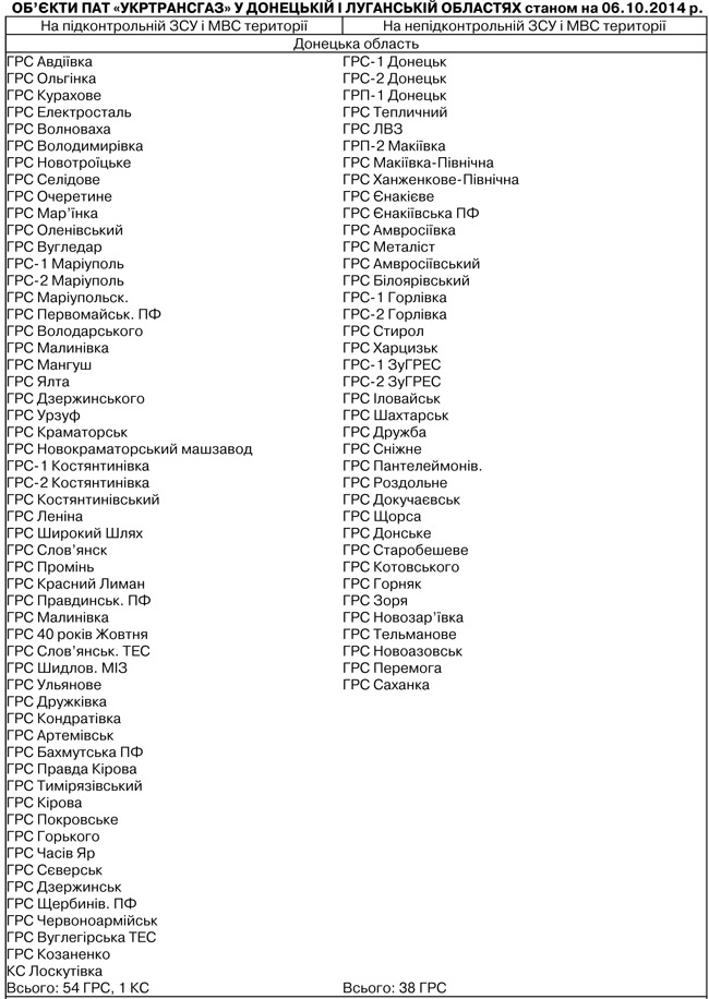 Станом на 6 жовтня, український оператор ГТС - ПАТ "Укртрансгаз", а точніше, його регіональний підрозділ "Донбастрансгаз" у Донецькій області, а точніше, на контрольованій Збройними силами України та МВС території, має доступ і контролює роботу 54 газорозподільних станцій (ГРС). Забезпечує загальний добовий обсяг споживання цієї території в 3,786 млн кубометрів газу, з яких промислові споживачі використовують 2,223 млн, населення - 1,563 млн. Підконтрольна також одна компресорна станція (КС) Лоскутівка.