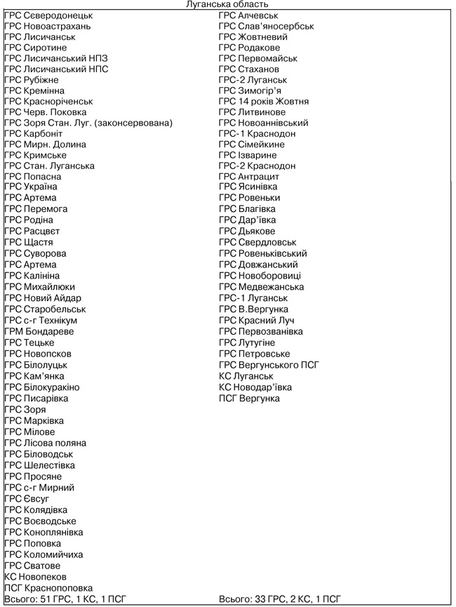 У Луганській області на контрольованій Збройними силами України та МВС території розташовані 51 ГРС, а також компресорна станція Новопсков і ПСГ Краснопопівка. Загальний добовий обсяг споживання -