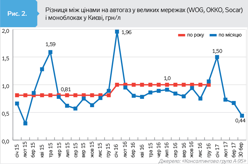 1,50 грн/л. Однак уже до кінця березня, коли ситуація стабілізувалася, запаси обновилися, і різниця скоротилася до 44 коп./л.