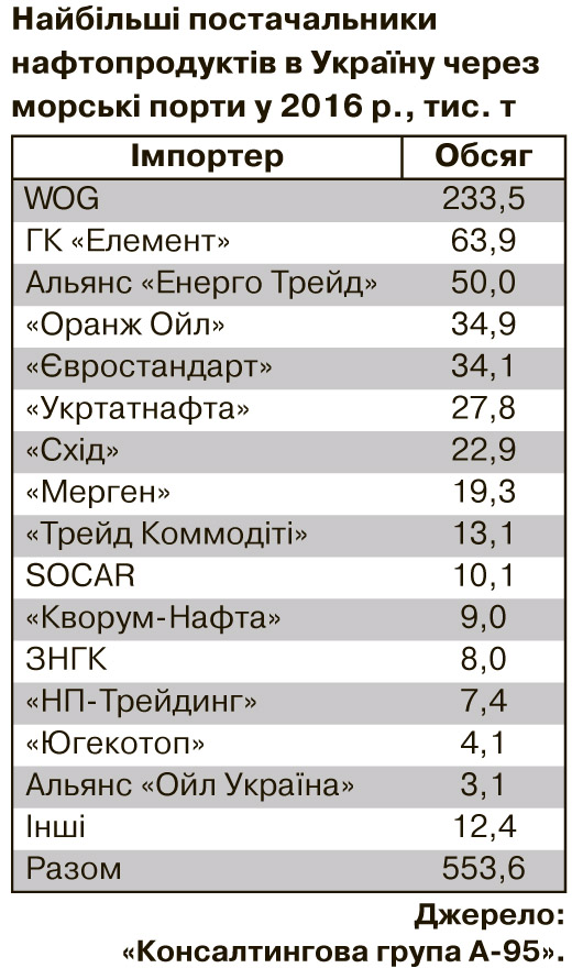 Результат такого ціноутворення видно на прикладі групи компаній WOG - мейджора в морських поставках. У 2016 р. вона скоротила імпорт з півдня на 80 тис. т, до 145 тис. т, закупивши по "трубі" 153 тис. т дизпалива.