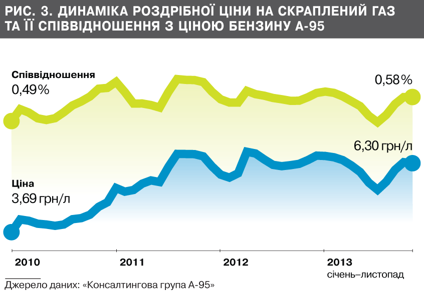 Зростанню ринку 2013-го сприяла здебільшого приємна для споживача ціна на газ, яка влітку "пірнула" набагато нижче 50% від вартості бензину А-95. Особливо значний приріст споживання це забезпечило в столичному регіоні - найбільшому за місткістю в країні.