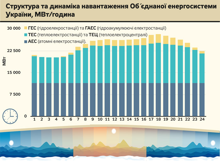 За даними НЕК "Укренерго", різниця потужностей у щоденному графіку навантаження енергосистеми (різниця максимуму та мінімуму протягом дня) сягає 8000 МВт у період максимального зимового енергоспоживання та близько 5000 МВт у літній період, що становить 10–15% усієї встановленої генеруючої потужності країни. Складність маневрування на сьогодні зумовлена тим, що близько 20 енергоблоків ТЕС перебувають у ремонті. Їх загальна потужність становить 4000 МВт. Крім того, періодично не працюють атомні енергоблоки потужністю 1000 МВт.