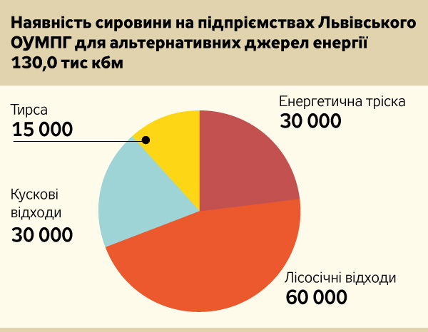Отже, у Львівській області є майже 400 тис. кубометрів, або 290 тис. т (1 кубометр дорівнює 0,7–0,8 т), деревної маси, потенційно придатної для виготовлення паливної тріски. Якщо зважити на те, що 3,5 т паливної тріски за калорійністю еквівалентно 1 тис. кубометрів природного газу, то це - близько 80–90 млн кубометрів газу, або 690 тис. Гкал тепла.