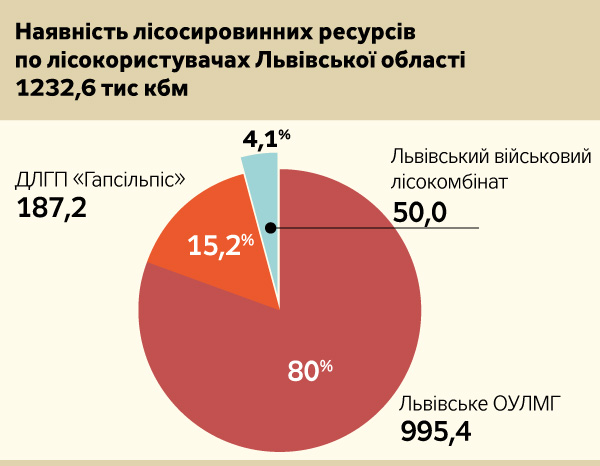 Як повідомив DT.UA начальник Львівського ОУЛМГ Анатолій Дейнека, щороку лісгоспи цього управління заготовляють 1 млн кубометрів деревини. З них круглі лісоматеріали становлять 427 тис. кубометрів (42%), деревина для технологічних потреб (у т.ч. промисловості) - 246 тис. кубометрів (33%), решта 327 тис. кубометрів (25%) - це паливні дрова.